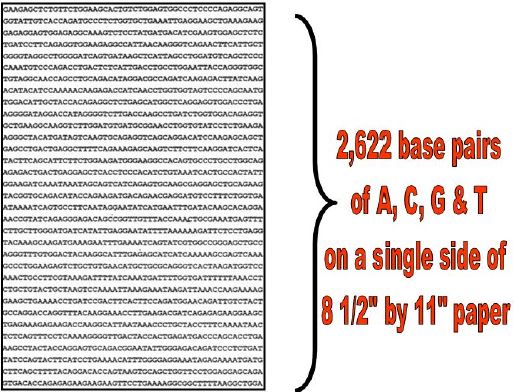 Using Microsoft Word, with a Times New Roman 12-point font on 8.5" × 11" paper and displaying A, C, G and T in capital letters in equal numbers, you can fit 57 letters on a line and 46 lines on one side of a page, thus representing 2,622 base pairs per page (single sided). Using Microsoft Word, with a Times New Roman 12-point font on 8.5" × 11" paper and displaying A, C, G and T in capital letters in equal numbers, you can fit 57 letters on a line and 46 lines on one side of a page, thus representing 2,622 base pairs per page (single sided). Thus, 1,206,980 single-sided sheets would be needed to display the entire human genome in this way. A modern ream of printer paper consists of 500 sheets of paper and is about 2.1" thick.