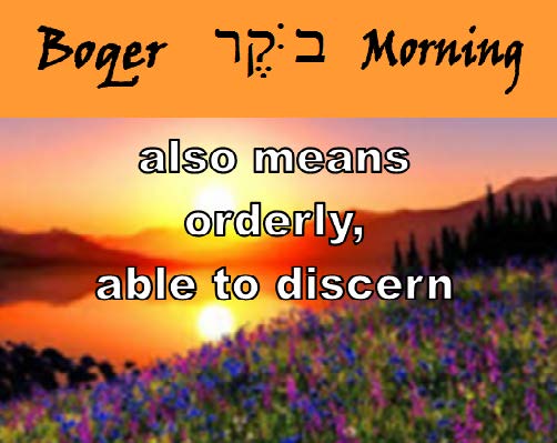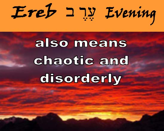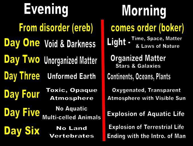 The Hebrew word for evening is “ereb”, which means “chaotic or disorderly.” The Hebrew word for morning is “boqer” meaning “orderly.” On Day One, God created light from darkness and brought order to the chaos. On the second day, He continued His work and brought about more order. This continued through Day Six until creation was complete and therefore the “ereb” (disorder) of creation was brought into order "boqer" (order).